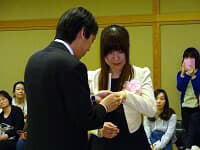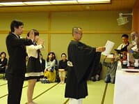 | ※ 2016年3月21日(月・祝) 安佐南区民文化センター大広間にて、当道院助教、H川(旧姓M脇)の結婚式を、金剛禅式にて挙行しました。 道院・法縁拳士、保護者の参席、ご協力の中、坪井道院長の司婚により簡素ながらも粛々と執り行われました。 詳しくは、道院長ブログ「毘沙門さんのお膝元」もご覧ください。 |