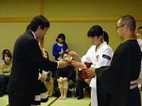| ※ 2016年1月30日(土) 2016年一般部新年会を行いました。 また、H拳士の結婚お祝いを合わせて行い、道院より新姓の入った道衣と帯をプレゼントしました。 詳しくは、道院長ブログ「毘沙門さんのお膝元」をご覧ください。 |